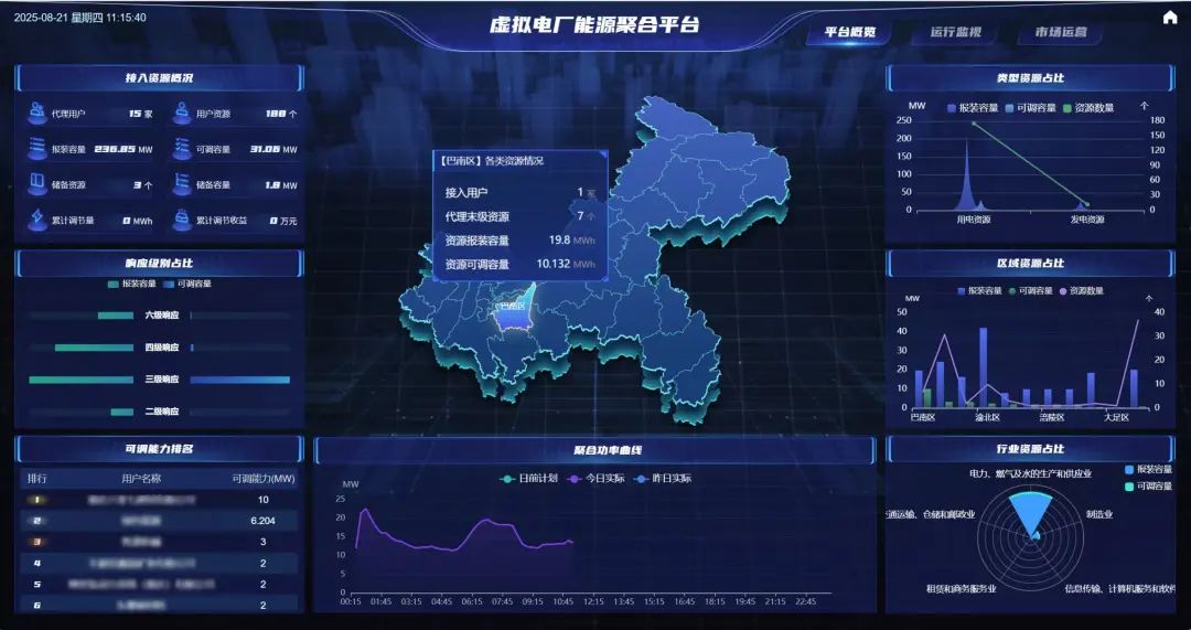 重庆大唐虚拟电厂目前已实现了多元可调资源接入、物联设备接入、市场交易申报、协同响应互动、用户分摊结算、大屏数据监视等功能。该平台通过聚合工业可调节负荷充分参与虚拟电厂需求侧响应,为用户及平台保证了持续的收益增长,同时大大增强了用户粘性。
