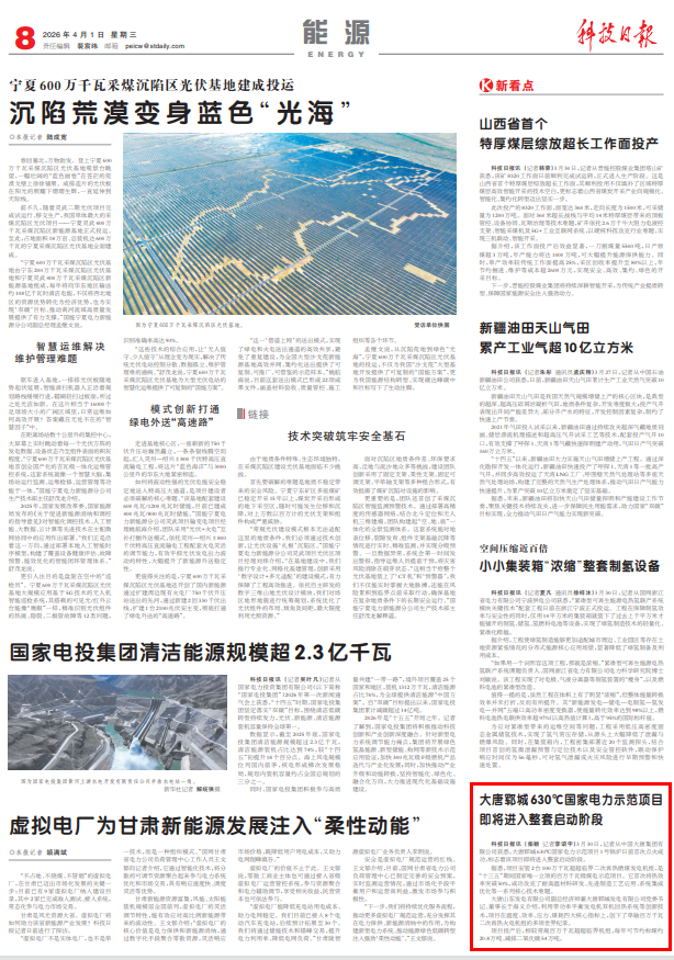 [科技日报]2026-4-1-8大唐郓城630℃国家电力示范项目即将进入整套启动阶段